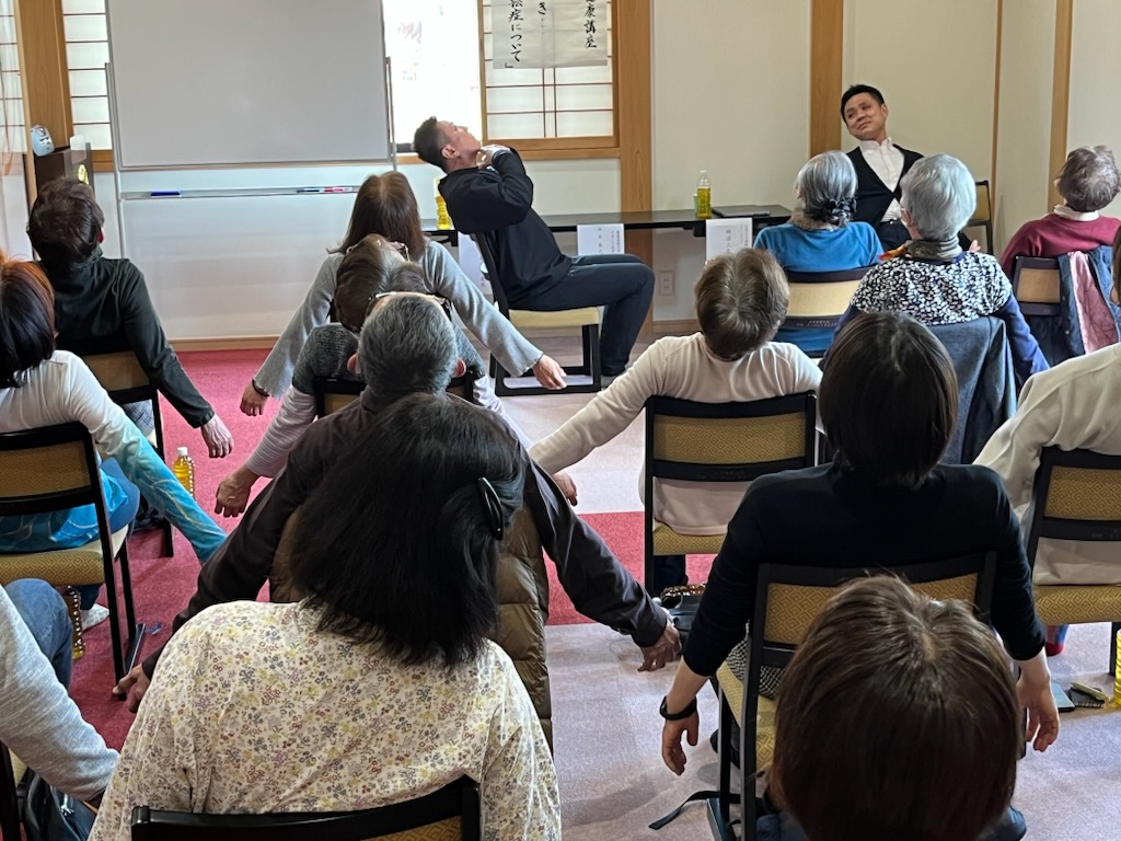 西願寺ヨガのインストラクター、ミエコ先生に西願寺体操を「佛教讃歌:仏のみ名をききひらき」